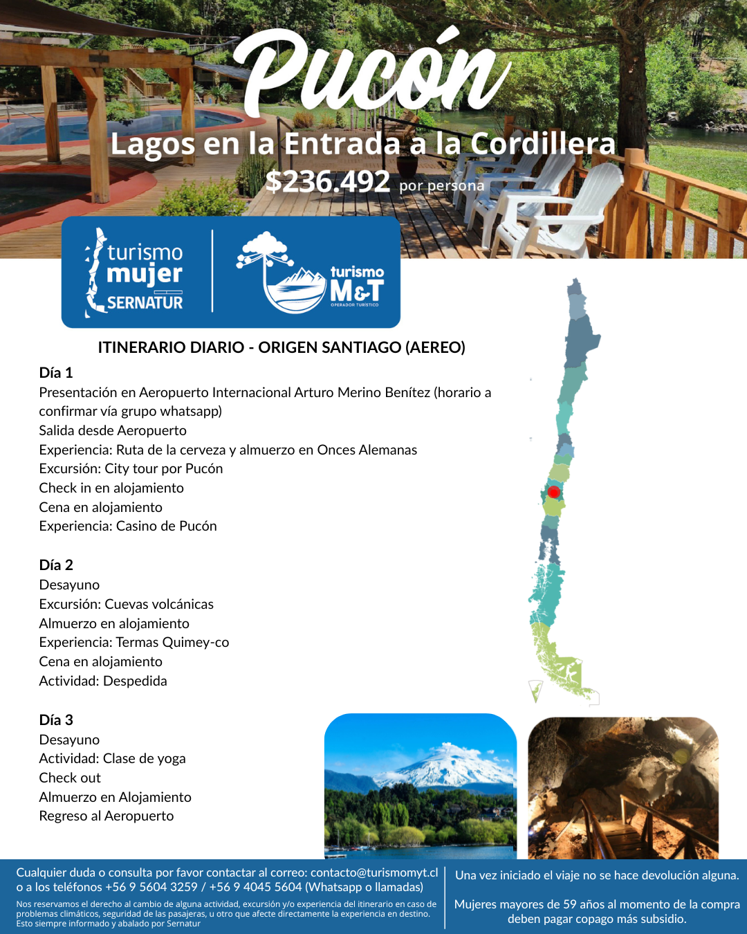 • En caso de cancelación del viaje por parte de Sernatur, se ofrecerá un reembolso total o la opción de reprogramar para una fecha futura.