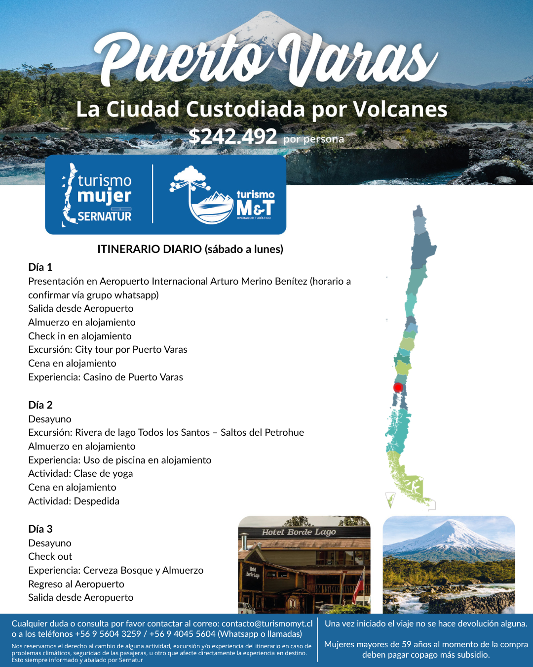 - Los presentes Términos y Condiciones regulan el uso y participación en los programas de Turismo Mujer organizados por Sernatur. Al inscribirse en cualquiera de los viajes, actividades o experiencias, usted acepta de manera plena y sin reservas los términos establecidos en este documento.
